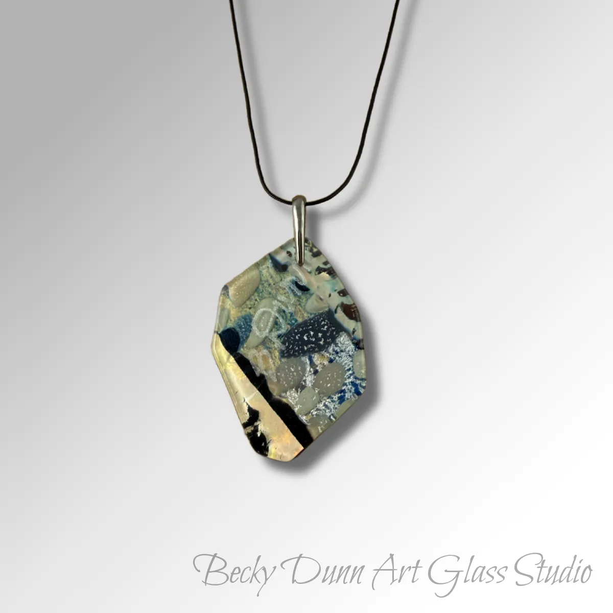 This free form shaped pendant is created by interlacing thin silver sheet imported from Italy with French vanilla, dense white, and black art glass. Many of the color variations are a result of the colorants in the glass reacting to each other and the silver. Subsequently, it undergoes firing in a kiln to transform it into a truly distinctive and captivating piece of art glass. A 19” black wire wrapped chain and sleek gun metal pinch bail are the finishing touches. I inscribed my name on the back with a diamond grinding bit. I work alone and I hand crafted each step of the process to create this distinctive pendant.
