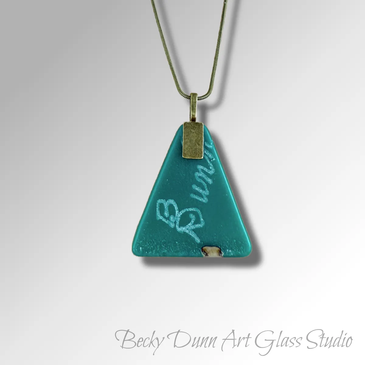 This half moon shaped pendant is created by interlacing thin silver sheet imported from Italy with French vanilla, aventurine green, aqua blue, amber, sea blue, teal, and clear art glass. Many of the color variations are a result of the colorants in the glass reacting to each other and the silver. Subsequently, it undergoes firing in a kiln to transform it into a truly distinctive and captivating piece of art glass. A 20” antique brass finished snake chain and bail are the finishing touches. I inscribed my name on the back with a diamond grinding bit. I work alone and I hand crafted each step of the process to create this distinctive pendant.