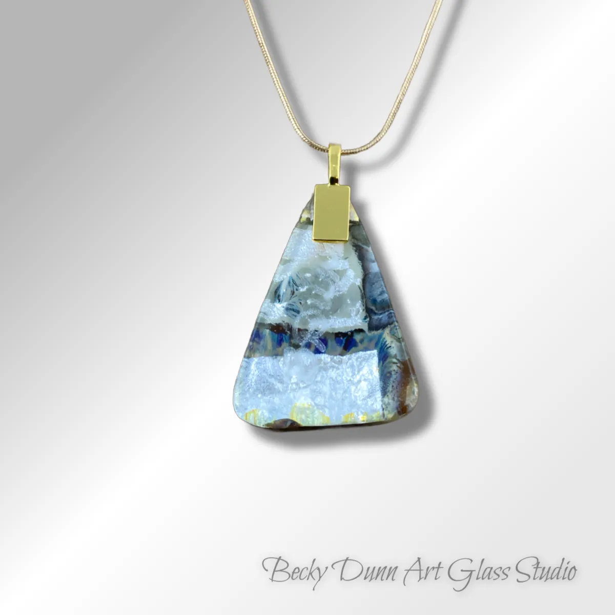 This triangular pendant is created by interlacing thin silver sheets imported from Italy with layers of French vanilla, dense white, and amber art glass. Many of the color variations are a result of the colorants in the glass reacting to each other and the silver. Subsequently, it undergoes firing in a kiln to transform it into a truly distinctive and captivating piece of art glass. A 19-inch gold plated snake chain and sleek bail complete the finishing touches. I inscribed my name on the back with a diamond grinding bit. I work alone and I hand crafted each step of the process to create this distinctive pendant.