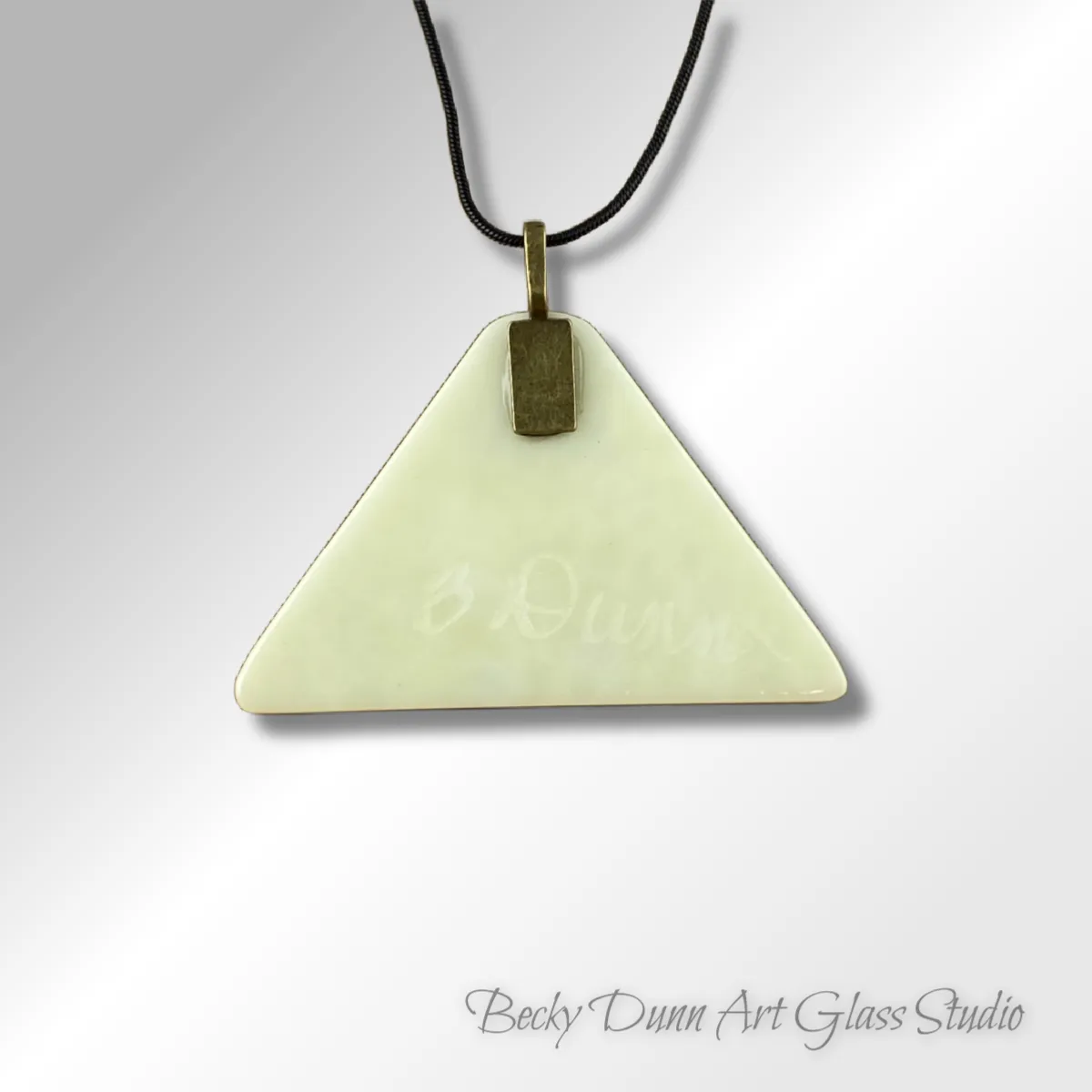This triangular pendant is created by interlacing thin silver sheets imported from Italy with layers of French vanilla, dense white, and amber art glass. Many of the color variations are a result of the colorants in the glass reacting to each other and the silver. Subsequently, it undergoes firing in a kiln to transform it into a truly distinctive and captivating piece of art glass. A 17-inch elegant black, wire wrapped chain and sleek antique brass tone bail complete the finishing touches. I inscribed my name on the back with a diamond grinding bit. I work alone and I hand crafted each step of the process to create this distinctive pendant.